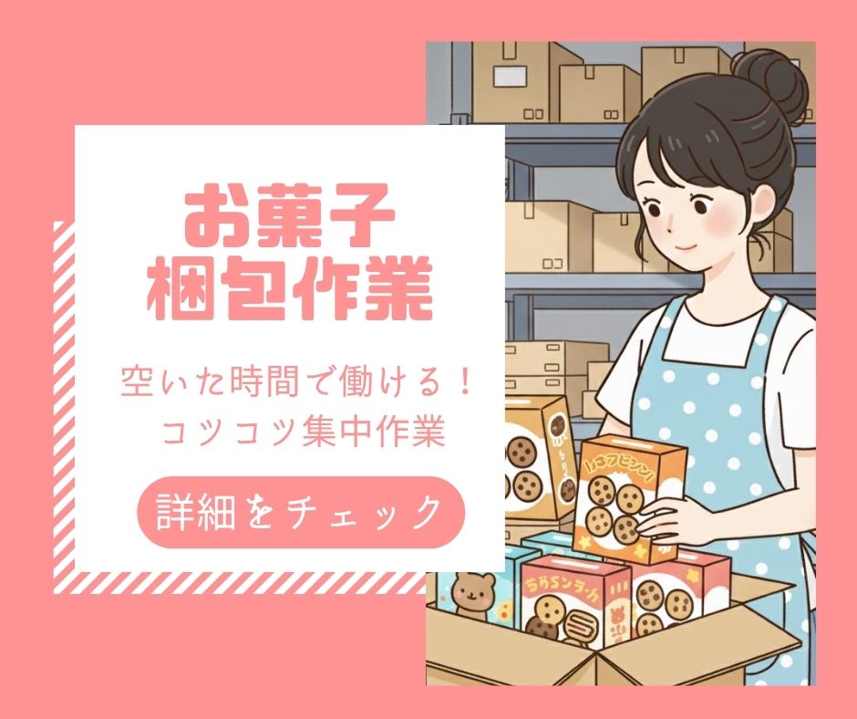 【内容】出来上がったお菓子が入った複数の袋を、ひとつの大きな袋にとまとめて入れたりまた、お菓子の入った箱を運んだりする簡単なお仕事です