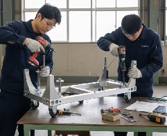 重量約28kgの台車を2人1組にてインパクトドライバーとリベッターを用いて組立作業、そのほか不随作業