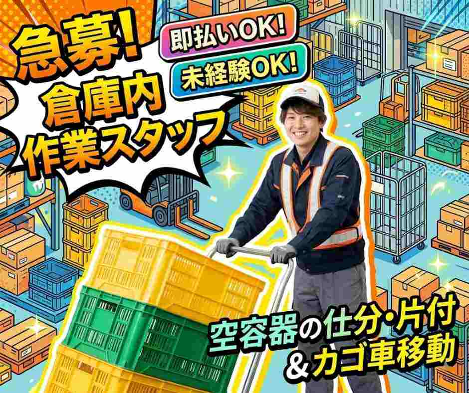 【作業内容】倉庫内で空容器の仕分片付作業やカゴ車を所定の場所に移動させる作業。