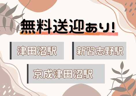 【交通手段】津田沼/京成津田沼/新習志野から送迎あり