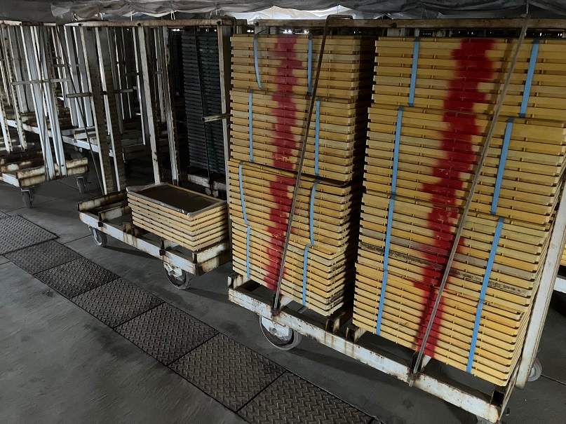 ・肥料、苗を入れた苗箱を台車に積み込む作業