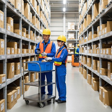 物流倉庫内でのコンテナからのレールを使用した荷下ろし、