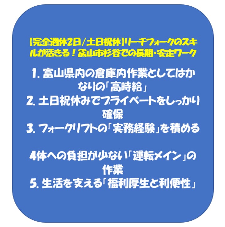 「リーチ式フォークリフト」の操作は、物流業界で非常に重宝されるスキルです。 免許を持っていても実務経験が少ない方は、ここでしっかり働くことで**「現場経験のあるフォークマン」としての市場価値**を高めることができます。将来的なキャリアアップにも繋がります。