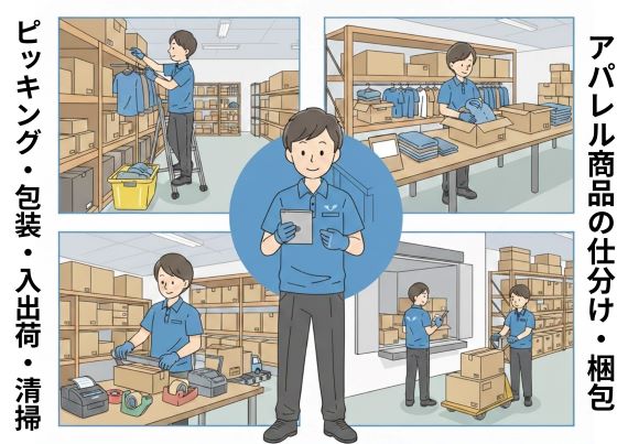 物流倉庫内 アパレル商品のピッキング・仕分け・梱包・包装・入出荷・清掃・その他付随作業