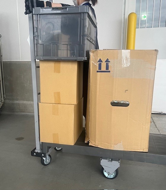 イオンモール内の倉庫で商品の仕分け作業、カゴ車に乗せてテナントへの配達