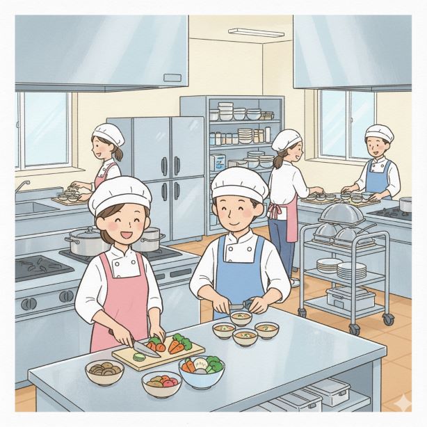 料理の盛り付けや洗浄業務といった補助が主になります。