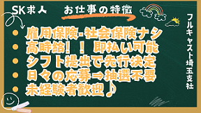 応募者の方には埼玉支社より電話でのご連絡をさせていただく場合がございます。 この求人情報では一度、採用見送りの通知がおこなわれる可能性がございます。