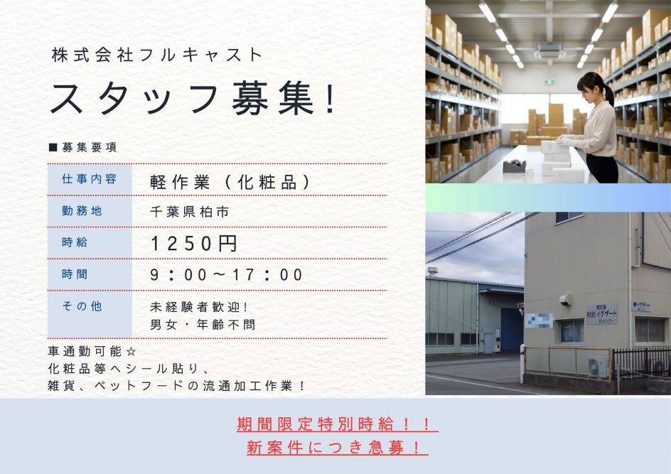 「化粧品のシール貼り・検品・梱包」「ペットフードのリパック」「カレンダー〇シール貼り&封入&梱包」等のお仕事!