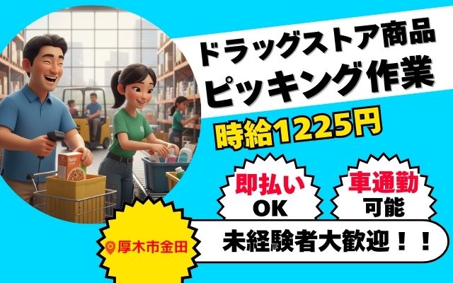車OK【即払】ドラッグストア商品の出荷/本厚木駅/時給1225円!