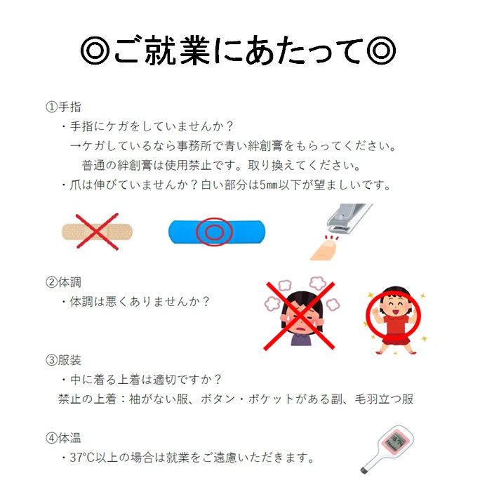 スリッパ・昼食・ゴム手袋 初回の方⇒身分証明書・マイナンバーが分かるもの |