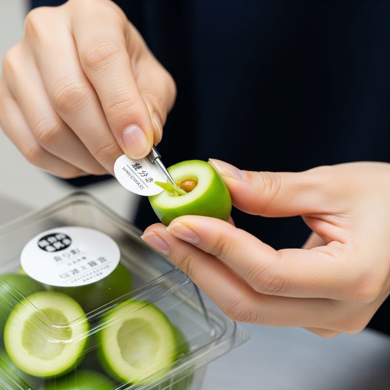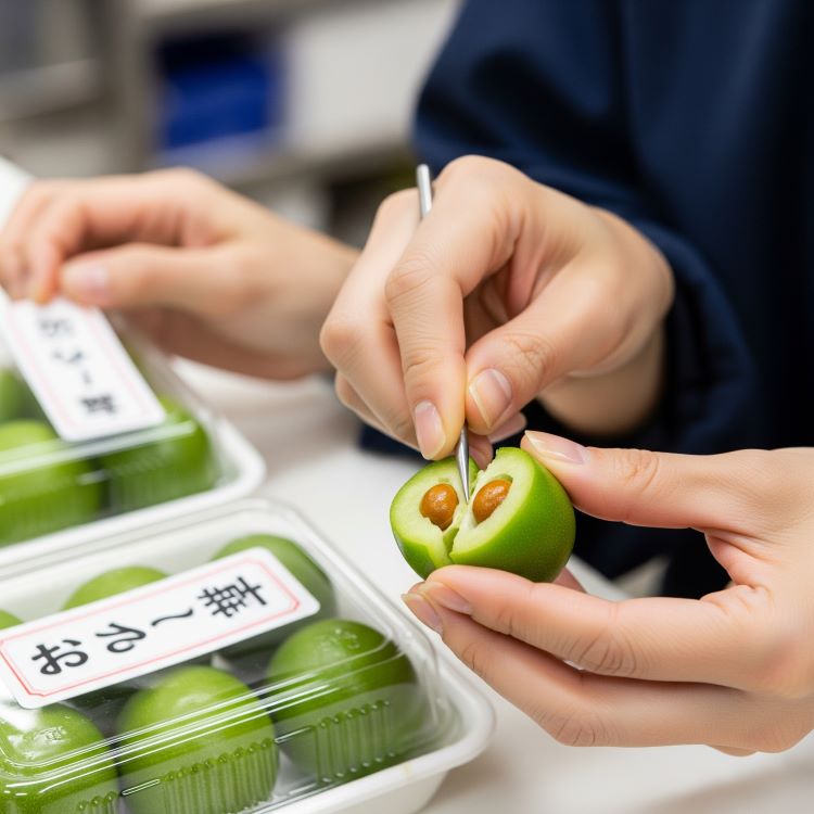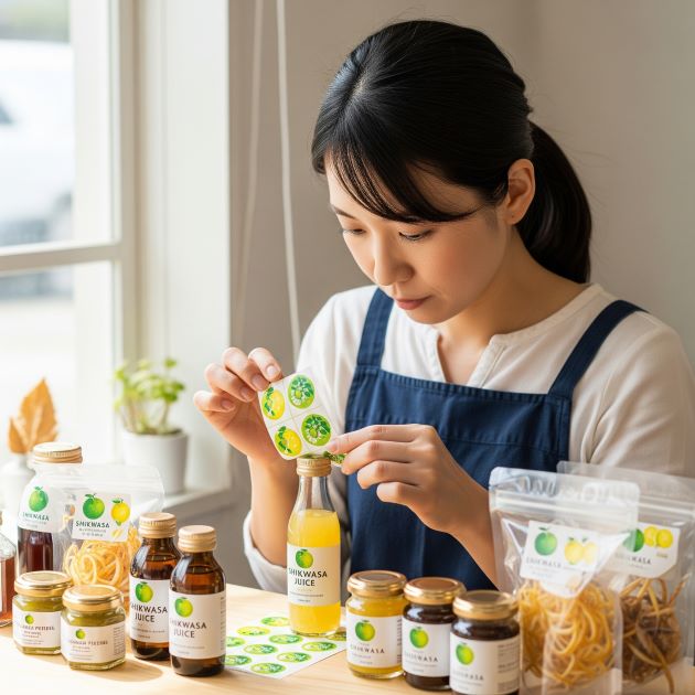 食品工場内でのシークワーサーの種取、製品のシール貼り、箱詰め