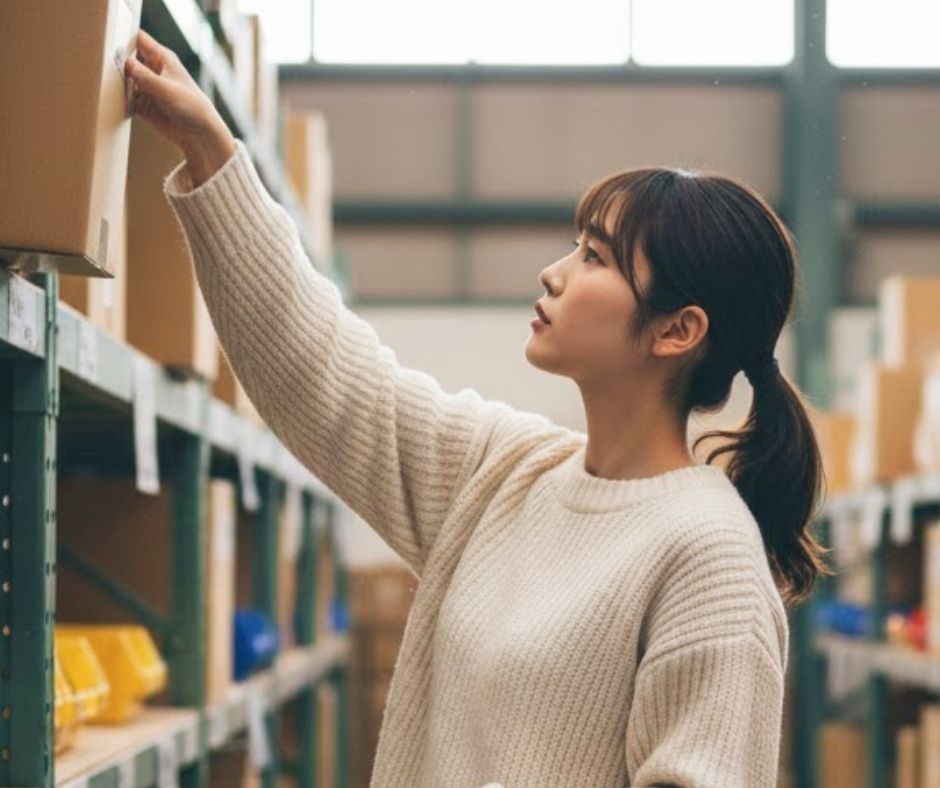 ・倉庫内に保管されている商品を出庫するために紙リストを見ながら台車を使ってピッキングする作業