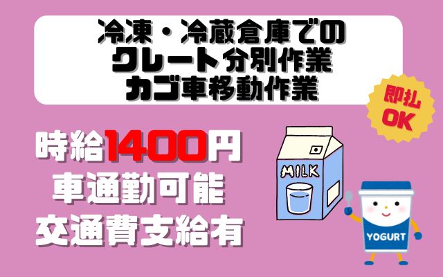時給1400円★車通勤可・交通費有・クレート分別作業・カゴ車移動作業・ドライアイス、蓄冷剤をオリコンに入れていく作業♪