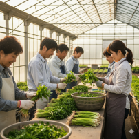 【作業内容】収穫されたみつばの、根と下葉を取り輪ゴムで束ねる作業です。