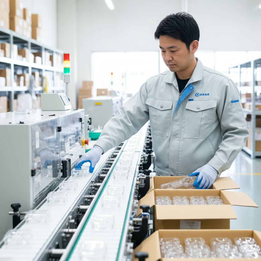 プラスチック製品の梱包・検品業務(機械が各レーンに製品を流していきます。その製品に傷がないか確認し、箱に並べていく作業です)