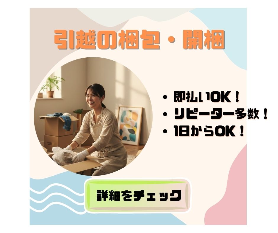 即払OK!時給1180円!天王寺区/引越の梱包開梱だけ