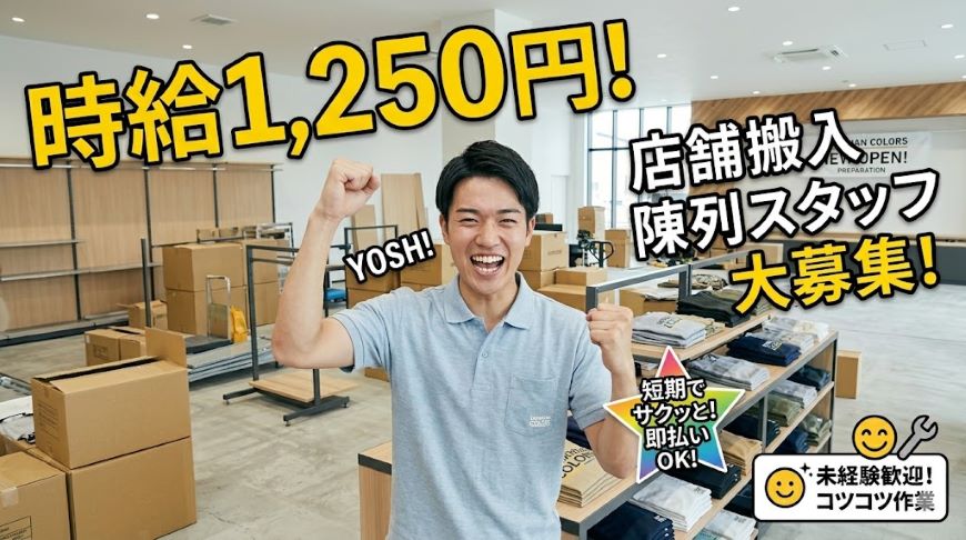 「短期間で効率よく稼ぎたい!」という方に朗報♪オープン前の設営・陳列は、お祭り気分で楽しく稼げるレアなお仕事です!即払いもOKだから、お財布もすぐにハッピーに♪1日単位で働けるから、空いた時間を有効活用しちゃいましょうっ☆