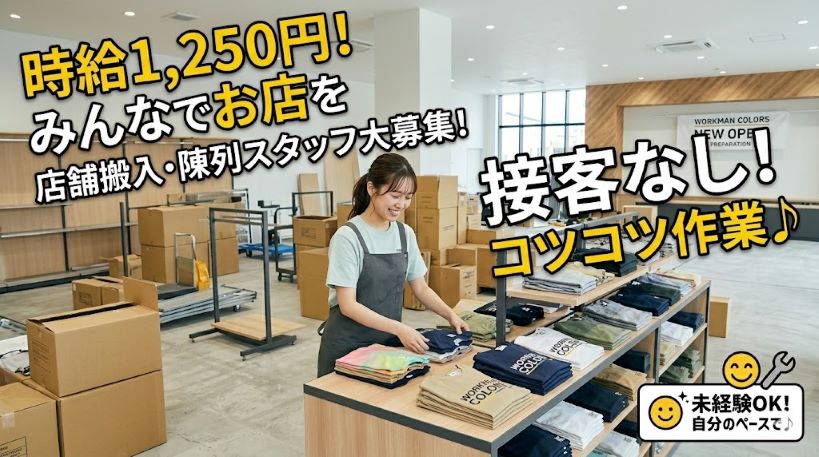 新店オープン前の店内で、商品の搬入(荷下ろし・運搬)や陳列、什器設置、検品、ストック整理など「お店作り」をお手伝いいただきます!
