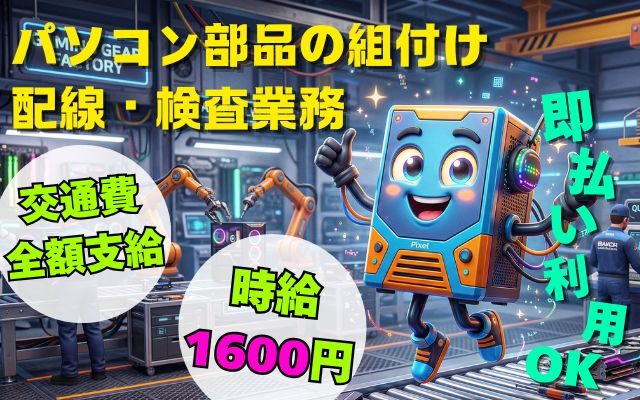 【交通費全額】時給1600円/PC部品の組付け・配線業務