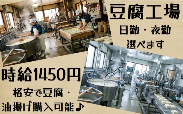大人気!豆腐工場でのお仕事♪選べる時間帯☆時給1450円