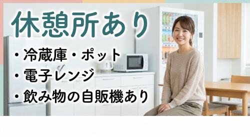 ・休憩所あり(冷蔵庫・ポット・電子レンジ・飲み物の自販機あり)