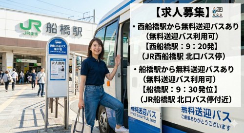 送迎バスあり西船橋駅・船橋駅からあり(西船橋駅:9:20発船橋駅:9:30発ぐらい)