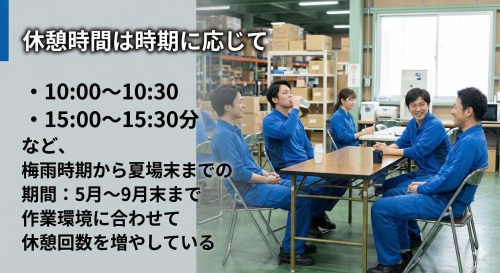 など、梅雨時期から夏場末までの期間:5月~9月末まで作業環境に合わせて休憩回数を増やしている