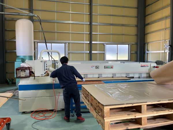 機械にアクリル板をセット→カットされて出てきた板の束をパレットに積み上げます。