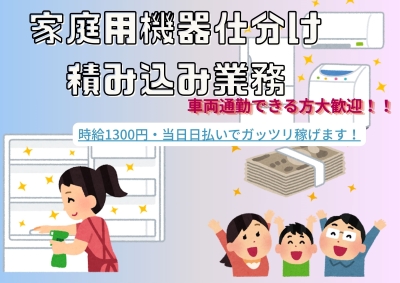 家庭用機器・仕分・積込≫高時給1300円★当日払い!!