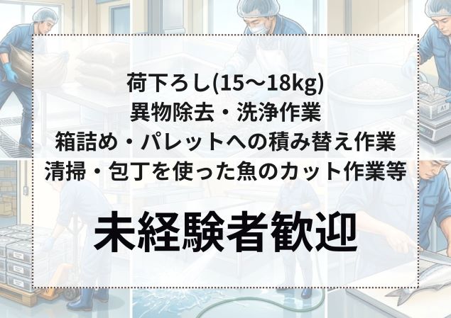 小売店や原料として卸すもずくの原料荷下ろし(15~18kg)、台の上での異物除去・洗浄作業、箱詰め、パレットへの積み替え作業、清掃、包丁を使った魚のカット作業等。