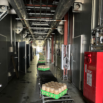 瓶の周りにプラ製のカバーを張り付ける作業。