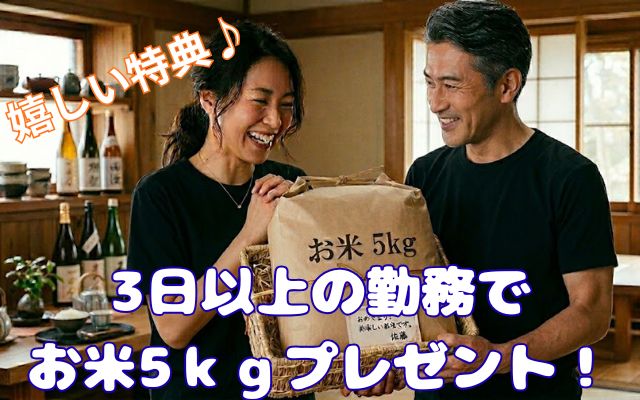 ホール・キッチン合わせて、5/2(ホール業務)を含む3日間以上のご勤務でお米5キロプレゼント♪