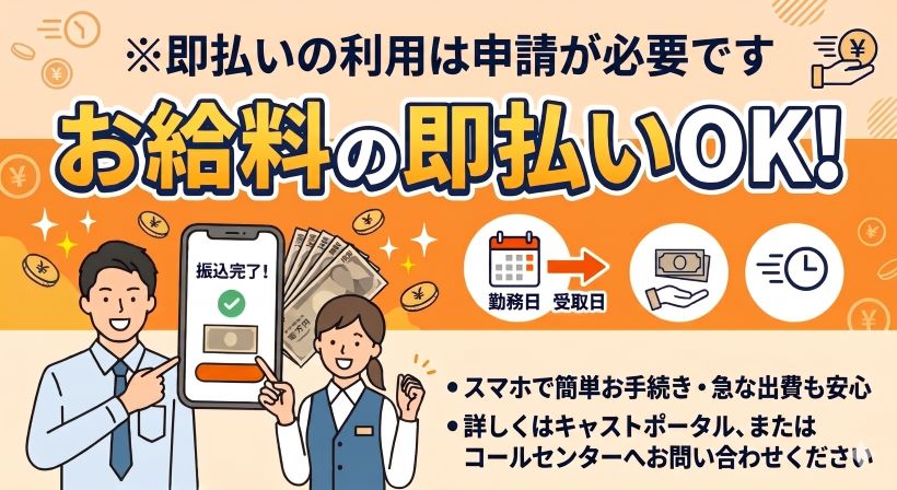 当社からご提供する月払いの給与振込前に、前払いでお金が受け取れるサービスです。最短就業当日に申請から即時(数分~1時間程度)で口座に給料GET出来ちゃいます♪