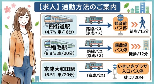 ・四街道駅(4.7㌔ 車/16分)~路線バス(京成バス)~観音前バス停~徒歩/15分)