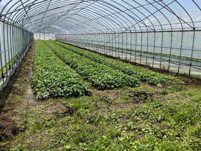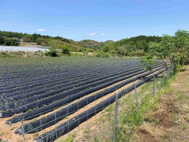 畑の畝(うね)に黒いビニールをかぶせ、一定間隔で穴を開けるお仕事もございます