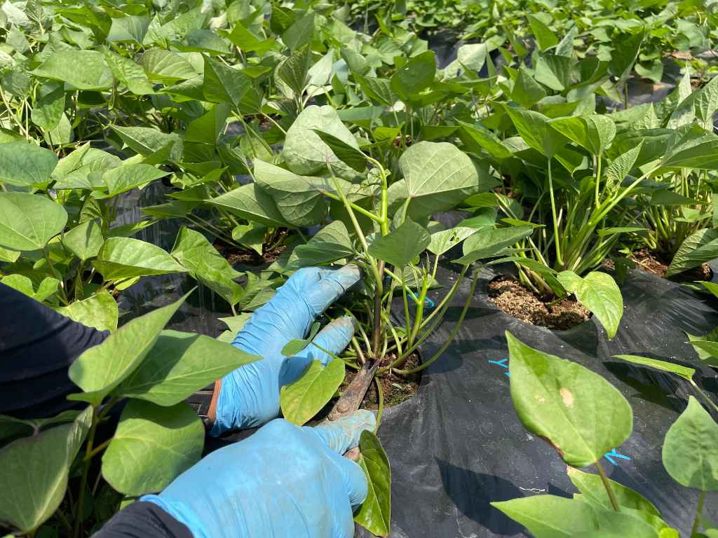 カットされたサツマイモの蔓(つる)を畑に植えていく作業です!