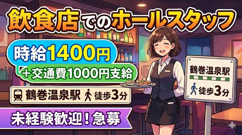 【即払】時1400円+交1000円/鶴巻温泉駅/飲食店ホール業務