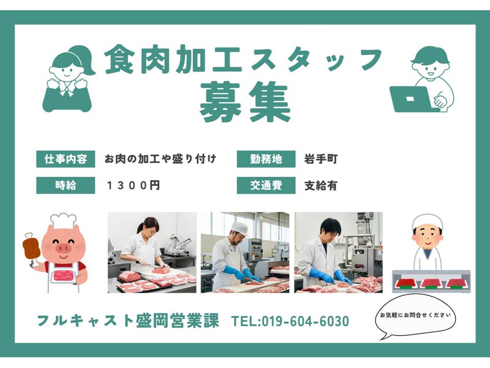 【滝沢市】お肉の加工♪高時給1300円 月・金お休みです
