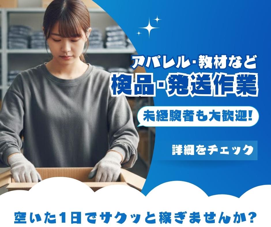 詳しい作業内容はお菓子、教材、アパレル等の検品や発送作業です。