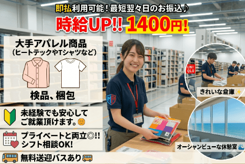 ★空調有/1400円+交★≪市川塩浜送迎≫★アパレル倉庫軽作業