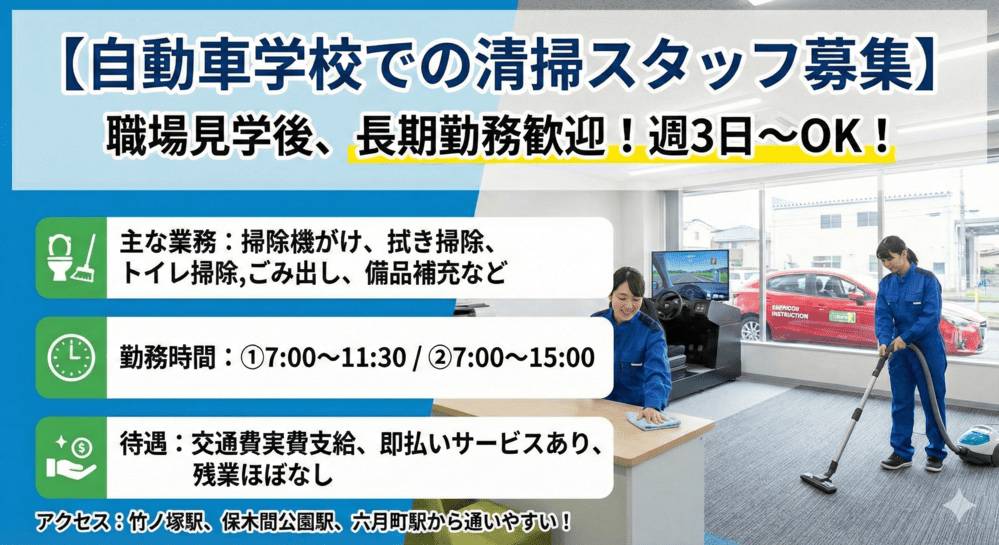 【時給1400円】自動車学校の施設内清掃≪竹ノ塚駅≫