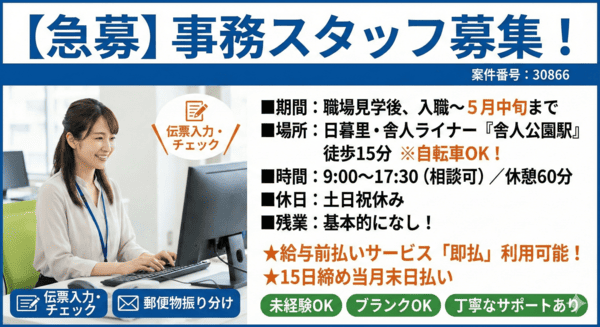 ・シンプル事務で高時給! 伝票入力やチェック、郵便物の振り分けなど、難しいスキル...