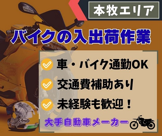 車通勤◎【本牧エリア】大手自動車メーカー★バイク入出荷作業