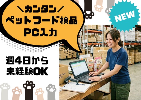 時給1500円≪倉庫でのカンタン検品・入力業務≫ペットフードを扱う倉庫でのお仕事!週4からOK!