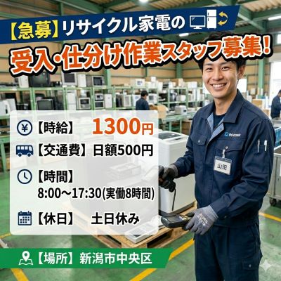 新潟市中央区にて、リサイクル家電の受付や仕分けをお任せするスタッフを募集しています。