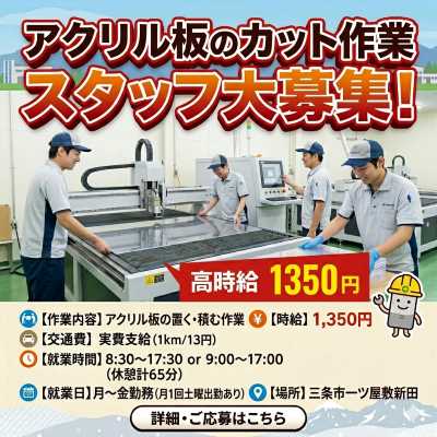 三条市一ツ屋敷新田にある工場で、アクリル板の加工をお手伝いいただくスタッフを募集します。