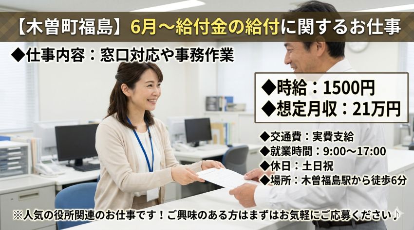 木曽:時給1500円6月~給付金に関する窓口・事務