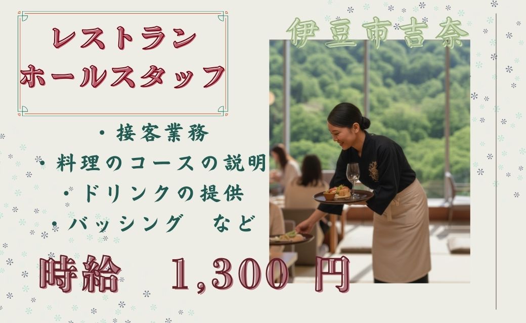 【伊豆市】ガッツリ稼げる!!未経験OK♪レストランのホールスタッフ