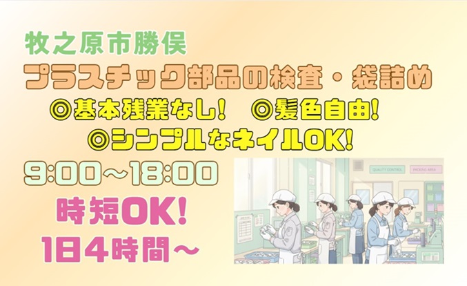 【牧之原市】1日4時間OK!自動車部品の検査・袋詰め業務!