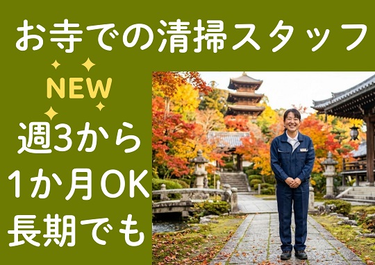 【時給1500円!】未経験OKお寺の清掃業務!週3~